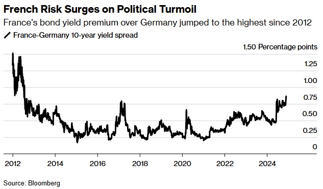 智通财经APP获悉,法国政治不确定性加剧,极右翼领导人玛丽娜·勒庞的财政部长表示,国民联盟尚未决定是否对预算的不信任动议进行投票,这可能导致政府垮台。法国总理米歇尔·巴尼耶在推动2025年预算时面临挑战,而国民联盟在谴责投票中扮演关键角色。这一政治动荡使得法国10年期债券与德国债券之间的利差扩大至90个基点,创2012年以来新高,引发投资者对法国政治和金融前景的担忧。