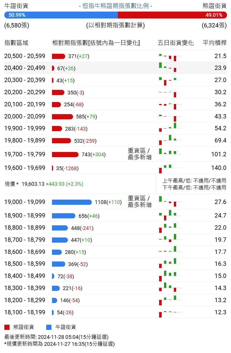 智通财经APP获悉,截至11月28日,恒指最新的牛熊街货比例为51:49。