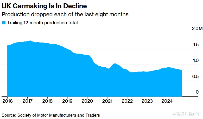 智通财经APP获悉,10月份英国汽车产量连续第八个月下滑,导致英国汽车行业协会警告称汽车制造商的前景将进一步恶化。