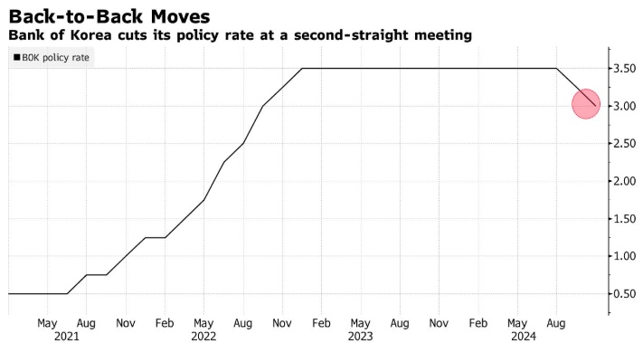 智通财经获悉,韩国央行周四连续降息,令市场感到意外。韩国央行还发布了更为悲观的经济增长预期,此举压低了债券收益率,推高了股市,并打击了韩元。韩国央行将7天期回购利率下调25个基点至3%,这可能是对特朗普当选总统后日益增长的贸易和经济担忧的预防性回应。