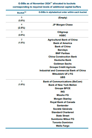 这些分组是基于29家全球系统重要性银行(GSIB)所需的额外资本缓冲。金融稳定委员会表示:“这些变化反映了银行基础活动变化的影响。其中,复杂性类别是得分变动的最大贡献者。”该委员会补充称,如果分组增加,该名单规定的较高损失吸收能力要求将从2026年1月1日起生效。