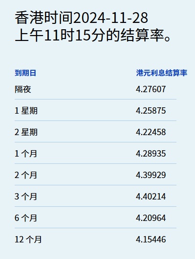 智通财经APP获悉,临近月结,港元拆息全线上扬,其中,隔夜息抽高近54基点至4.27607%,为11月11日以来最高,与楼按相关的一个月拆息连升三天至4.28935%,创近六周新高。