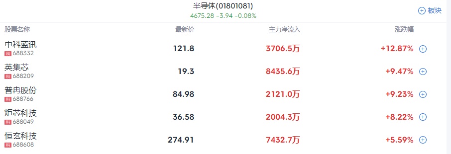 半导体板块冲高回落,寒武纪一度涨近10%续创历史新高,英集芯、中科蓝讯、炬芯科技、恒玄科技等跟涨。