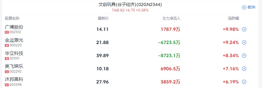 IP经济(谷子经济)概念股继续活跃,广博股份斩获7连板,倍益康、新世界等涨停,金运激光、华立科技等跟涨。