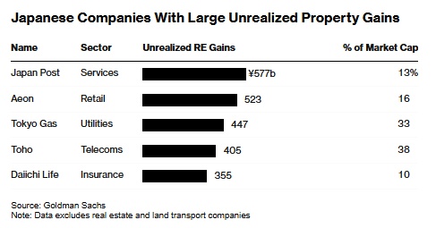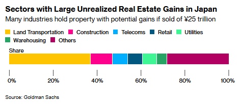 高盛估计,在250多家主营业务不是房地产的日本公司中,可能至少存在25万亿日元的未实现收益。其中持有最多这些资产的是铁路、建筑和公用事业行业公司。