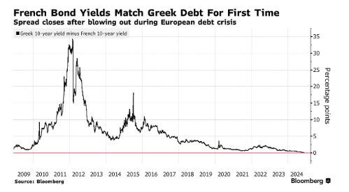 智通财经APP获悉,法国的基准10年期国债收益率有史以来首次与希腊持平,这意外使得这个欧元区第二大经济体与曾经处于欧洲主权债务危机中心的国家“平起平坐”。