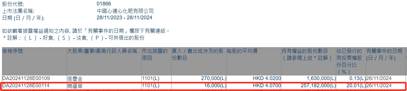 智通财经APP获悉,香港联交所最新资料显示,11月26日,执行董事闫蕴华增持中国心连心化肥(01866)1.6万股,每股作价4.07港元,总金额约为6.51万港元。增持后最新持股数目约为2.57亿股,最新持股比例为20.01%。