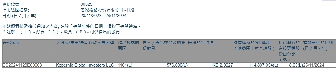 智通财经APP获悉,香港联交所最新资料显示,11月25日,Kopernik Global Investors LLC增持广深铁路股份(00525)57.6万股,每股作价2.0627港元,总金额约为118.81万港元。增持后最新持股数目约为1.15亿股,最新持股比例为8.03%。