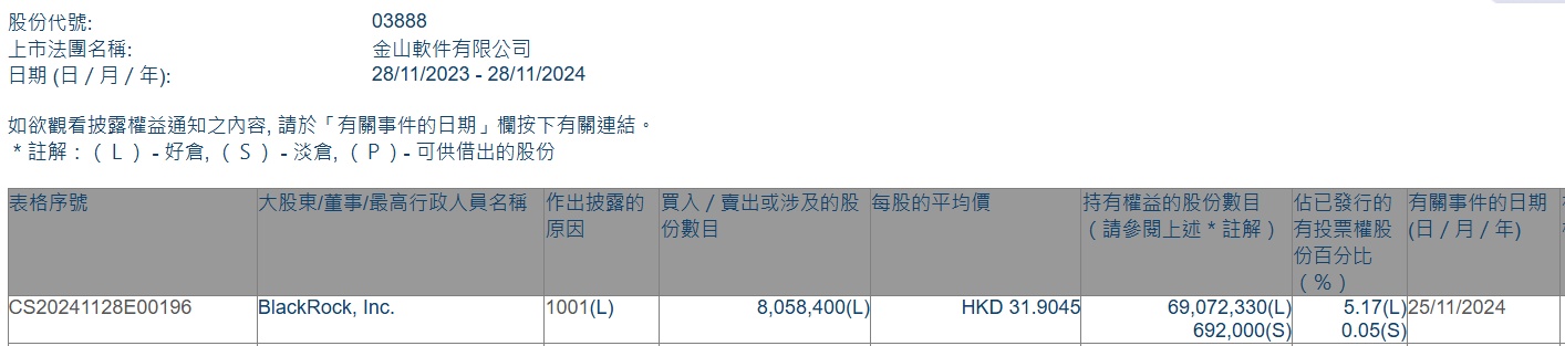 智通财经APP获悉,香港联交所最新资料显示,11月25日,贝莱德增持金山软件(03888)805.84万股,每股作价31.9045港元,总金额约为2.57亿港元。增持后最新持股数目约为6907.23万股,最新持股比例为5.17%。