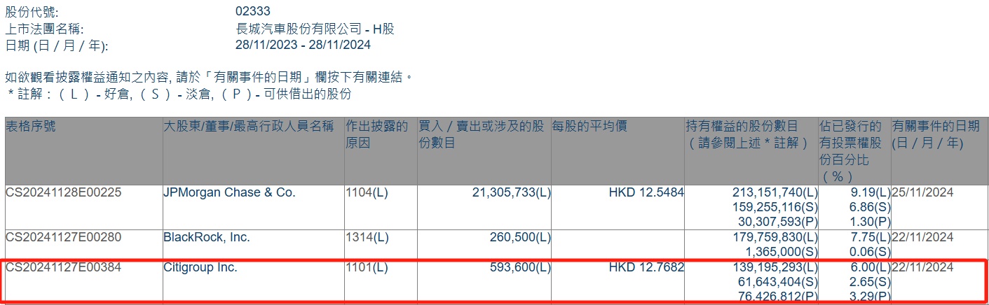 智通财经APP获悉,香港联交所最新资料显示,11月22日,花旗增持长城汽车(02333)59.36万股,每股作价为12.7682港元,总金额约为757.92万港元。增持后最新持股数目约为1.39亿股,持股比例为6%。
