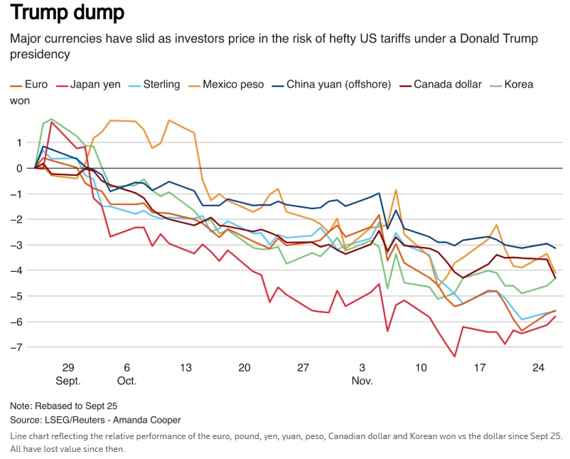 智通财经APP注意到,11月是特朗普在美国大选中获胜后明显的赢家和输家之月。事实证明,特朗普交易是成功的,从欧洲出口商到墨西哥比索,基本上是惩罚对关税敏感的资产,并推动投资流向美国股市和美元。美国股市反弹,美元兑主要货币上涨2%,比特币飙升。