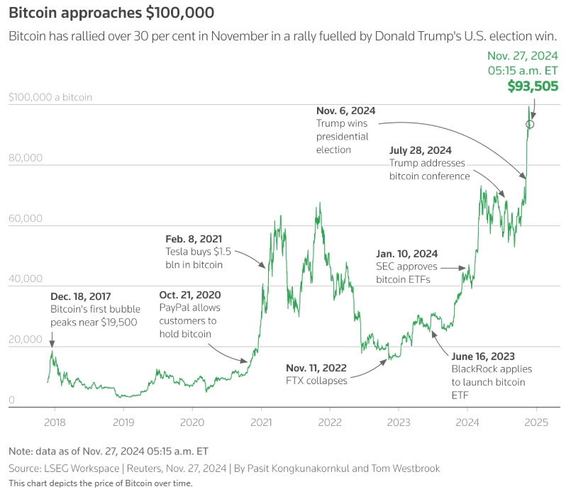 由于希望特朗普领导下的监管环境对加密货币更加友好,加密货币已经飙升37%,短暂地瞄准了10万美元的里程碑。