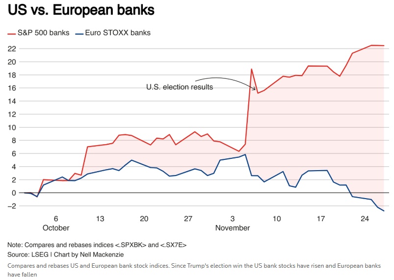 受特朗普政府放松管制的希望推动,美国银行股指数在11月份飙升13%,创下一年来的最佳表现。