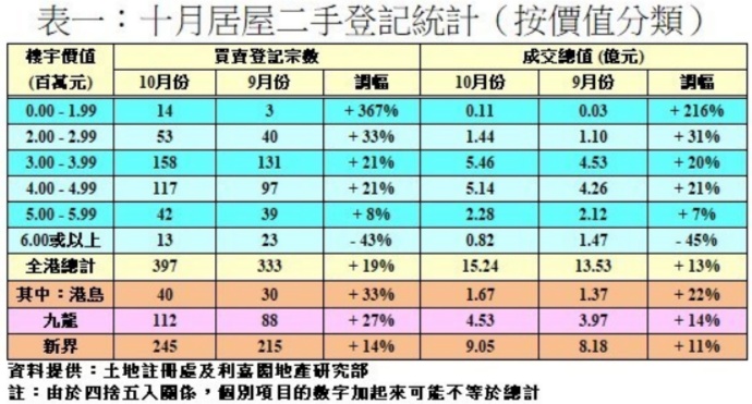 按楼价作分析,6个价格组别交投量录五升一跌,其中升幅最大的是价值200万港元以内组别,十月份二手居屋登记宗数为14宗,环比激增3.67倍或11宗;至于登记量最活跃的300万至400万港元以内组别则录158宗,较九月份的131宗增加21%。如以地区划分,港岛区十月份录40宗登记,环比上升33%;九龙区期内录112宗,环比增加27%;而新界区则录245宗,环比亦有14%增长。