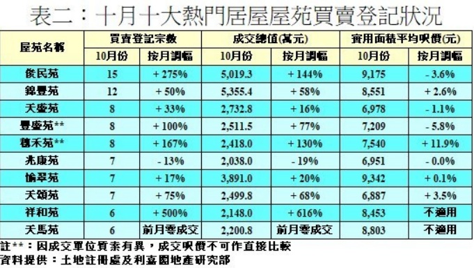 如按屋苑细分,十月份何文田俊民苑录15宗买卖登记,环比攀升2.75倍或11宗,跃登上月居屋屋苑登记量榜首,成交总值约5,019.3万港元;而马鞍山锦丰苑则以12宗登记屈居亚军,涉资约5,355.4万港元。