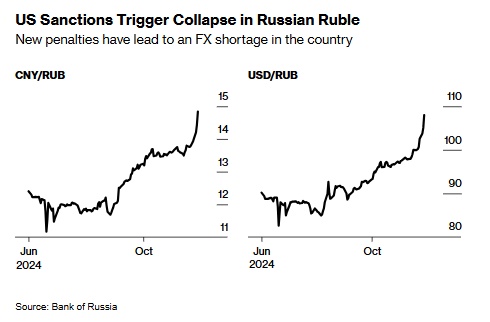 根据俄罗斯央行数据,自11月21日美国制裁约50家俄罗斯银行以来,卢布兑美元汇率已下跌近8%。这可能会加剧通胀,俄罗斯央行一直在努力通过将利率提高到历史最高水平来遏制通胀。