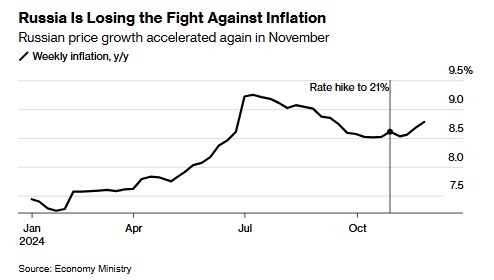 尽管10月加息,俄罗斯通胀仍连续第三周加速。该行的官方预测是在最近卢布贬值之前计算的,表明2024年底价格增长将达到8%-8.5%。俄罗斯央行顾问Kirill Tremasov承认,通胀有可能超过这一预期。