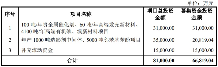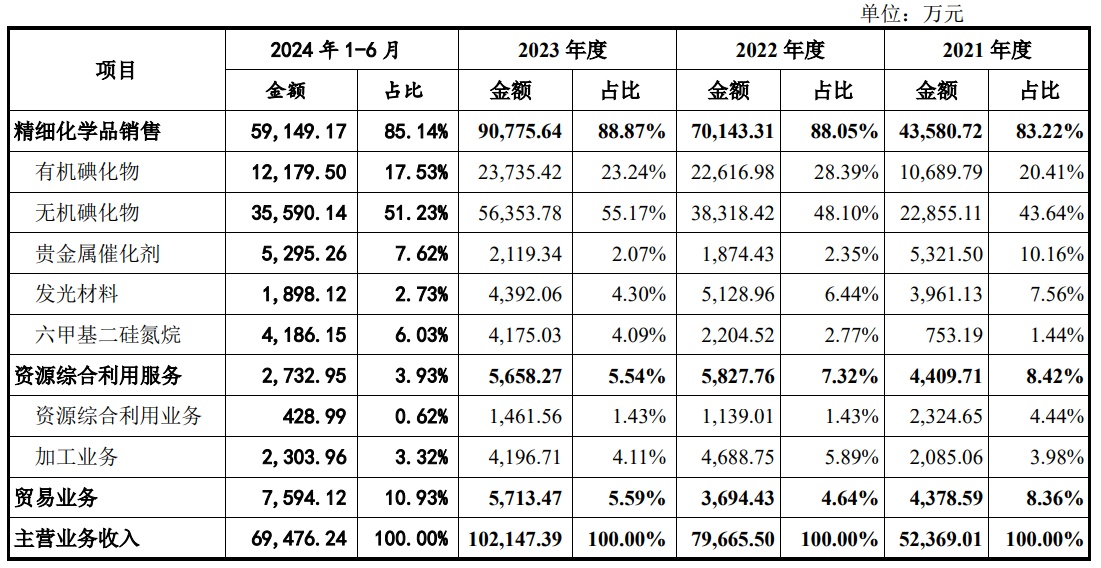 招股书披露,博苑股份是一家专业从事精细化学品研发、生产、销售及资源综合利用的高新技术企业,主营业务包括有机碘化物、无机碘化物、贵金属催化剂、发光材料、六甲基二硅氮烷等产品的研发、生产、销售,并基于资源综合利用资质与工艺技术优势开展含碘、贵金属等物料的回收利用业务,为客户提供贵金属催化剂、六甲基二硅氮烷等加工服务。发行人产品及服务广泛应用于医药、化工、光电材料、饲料、食品等领域。