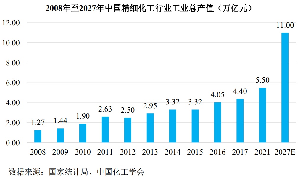 根据公开资料,我国精细化工产业2021年总产值突破5.5万亿元,预计2027年有望超过11万亿元。美国、欧盟及日本精细化工率接近或超过60%,我国计划到2025年将精细化工率提高到55%。