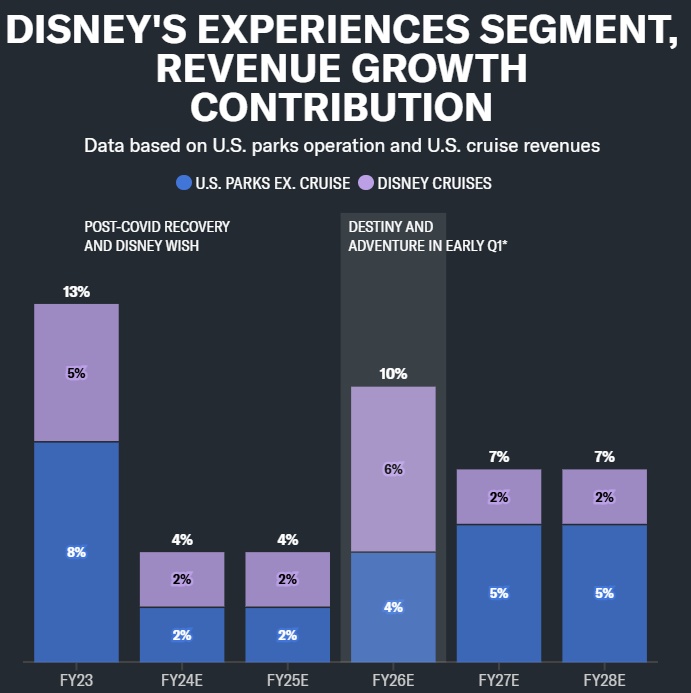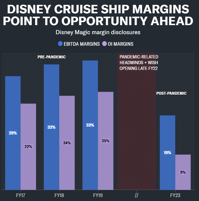 虽然利润率尚未恢复到那些高水平,可能是由于与船队扩张和邮轮行业整体持续复苏相关的启动成本,但分析师团队指出,“迪士尼的历史邮轮利润率和公共邮轮公司都表明,未来有机会实现有意义的营业收入贡献。”