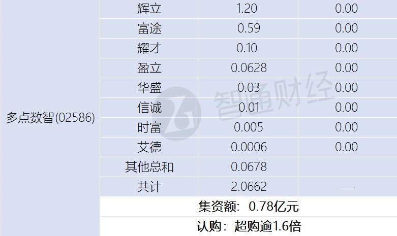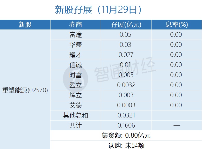 智通财经APP获悉,重塑能源(02570)、多点数智(02586)正在招股中。截止11月29日,辉立、华盛、耀才等券商合计为重塑能源借出0.1606亿港元,认购未足额;为多点数智借出2.0662亿港元,超购逾1.6倍。