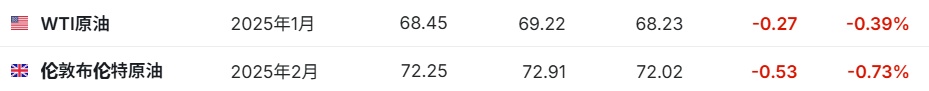 3. 截至发稿,WTI原油跌0.39%,报68.45美元/桶。布伦特原油跌0.73%,报72.25美元/桶。