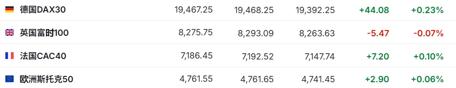 2. 截至发稿,德国DAX指数涨0.23%,英国富时100指数跌0.07%,法国CAC40指数涨0.10%,欧洲斯托克50指数涨0.06%。