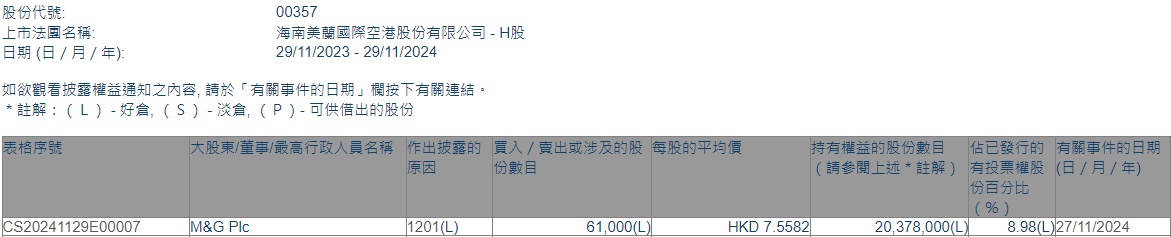 智通财经APP获悉,香港联交所最新资料显示,11月27日,M&G Plc减持美兰空港(00357)6.1万股,平均每股作价为7.5582港元,总金额约为46.11万港元。减持后最新持股数目为2037.8万股,最新持股比例为8.98%。