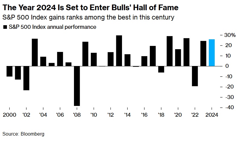 2024年美股注定要进入牛市名人堂——标普500指数涨幅在本世纪名列前茅