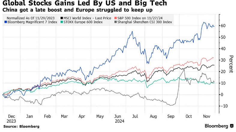 然而,美国股市的涨幅过于强劲,以至于欧股基准——斯托克600指数与标普500指数差距相比,预计将迎来表现最糟糕的一年。由于政治持续动荡,法国股市在2024年是发达市场中表现不佳的少数股票市场。