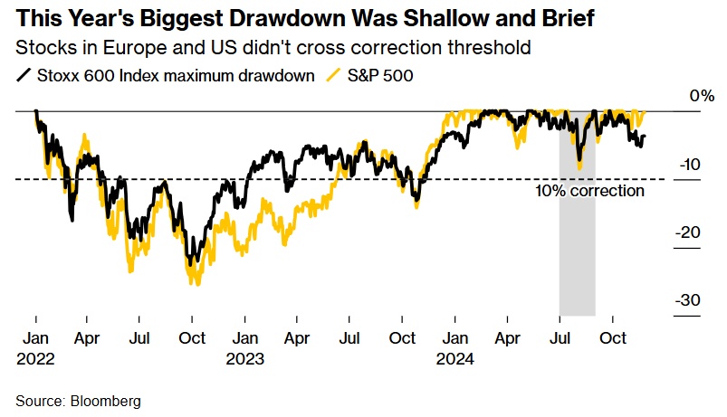 2024年迄今,美股市场波动温和,仅出现了一次大幅度回调:那就是夏季抛售浪潮,最终在8月左右引发了一次剧烈抛售。不过,下跌持续了不到一个月,未能突破通常被视为技术性质调整的“10%的门槛”。