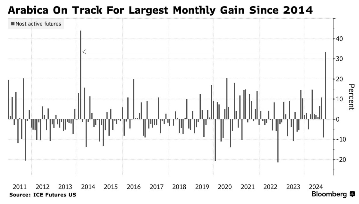 用于特制啤酒的咖啡豆供应短缺,本月推高了期货市场约32%。今年已经飙升了70%左右。