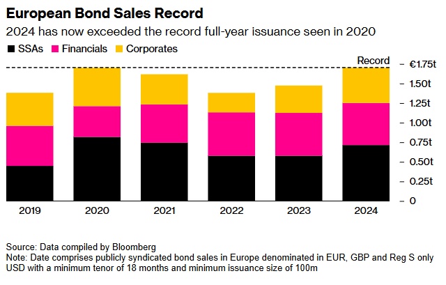 本周,欧洲债券市场异常活跃,债券销售量刷新历史新高。主权国家、超国家机构、金融机构等纷纷涌入借贷市场,为不断攀升的债务提供融资,这进一步刺激了公共部门借款人的发债热情。据悉,今年,欧洲债券发行量已达到创纪录的1.705万亿欧元(1.8万亿美元),超过了此前在2020年创下的最高水平。