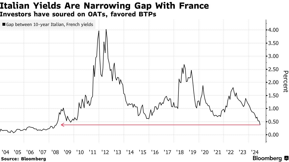 值得特别关注的是,法国作为传统上被视为安全稳定债券市场的国家,其声誉正面临严峻挑战。随着巴黎政治危机的持续发酵,法国的借贷成本可能很快就会超过意大利。这一转变不仅具有象征意义,更凸显出意大利政府债券长期以来虽然波动较大,但在当前却相对稳定。相比之下,法国的政治动荡严重阻碍了削减预算赤字的努力,导致其借贷成本不断攀升。