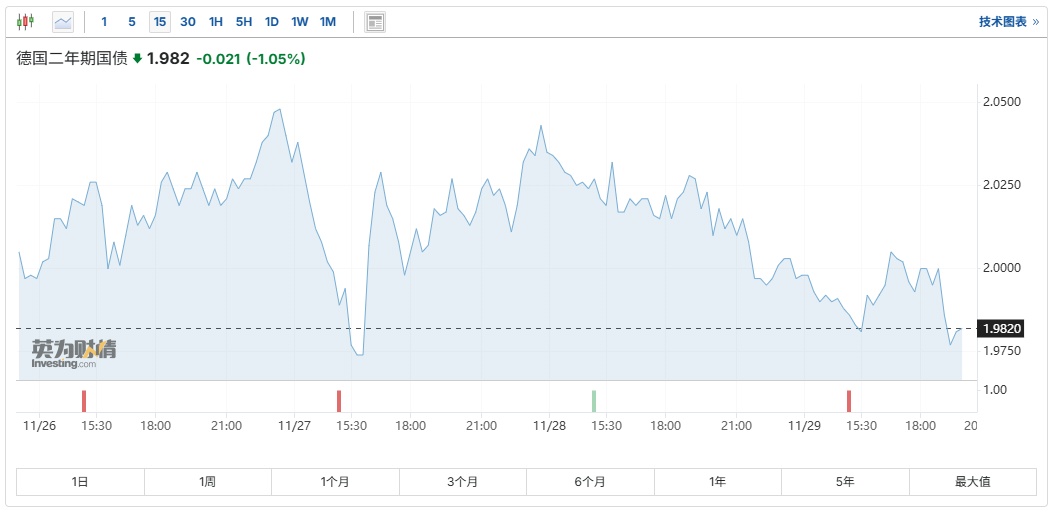 近期,受经济前景不明和通胀预期下滑的影响,投资者对欧元区长期政府债券的需求显著上升,导致收益率连续第四周下跌。德国两年期国债收益率更是大幅下跌1.05%,报1.982%。与此同时,法国政府为缓解政治危机对债务市场的冲击,已表示将在下一轮预算中作出让步,此举有助于稳定法国债务的风险溢价。