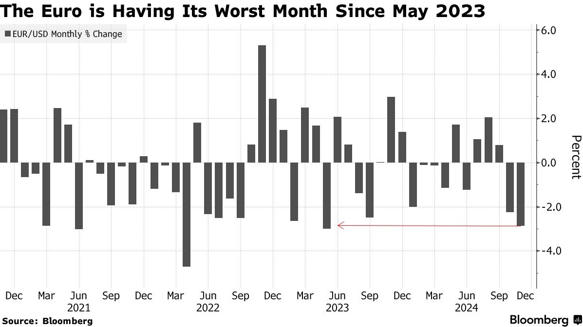 受美国贸易关税威胁、欧元区经济增长疲软及政治动荡等多重因素影响,欧元正经历一年多来表现最差的一个月,兑美元汇率大幅下滑。11月,欧元兑美元下跌约3%,逼近两年低点,创下自2023年5月以来的最大月度跌幅。投资者担忧美国关税将重创欧洲经济,促使政策制定者更积极地降息,导致欧元失宠。同时,德国和法国经济增长停滞的迹象也加剧了抛售压力。