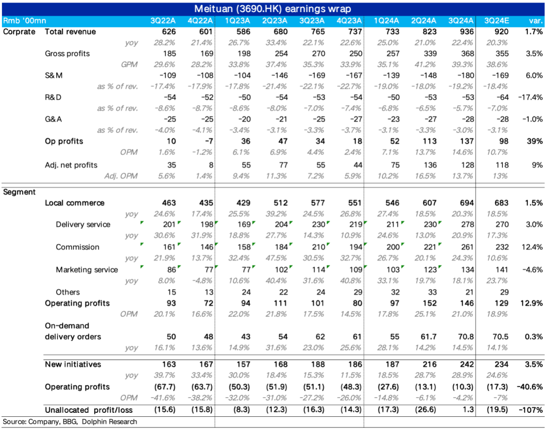 而核心的本地生活板块的经营利润为146亿,趋势上环比上季略有下滑,但符合暑期配送成本较高的季节性变化,公司对此也有指引。因此实际利润比彭博卖方预期多出17亿。结合前文,超预期利润的来源应当是以配送UE的改善为主,到店业务佣金率提升为辅。