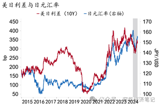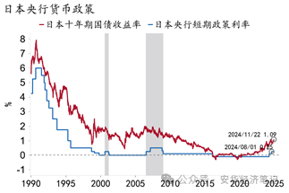 历史上,这种情况曾反复发生。日本在2006年7月和2007年2月两次加息至0.5%,导致日元套息交易平仓,全球流动性收缩,加快了美国次贷危机的到来。结果是,2006年第二季度S&P 500指数下挫7.3%,日经指数回调19.1%,日元汇率上涨4.2%;至2009年初,日元累计升值逾两成,美日股市均被腰斩,美国次贷危机演变成全球性金融风暴。历史不会简单重复,但却押着相同的韵脚。日本央行2024年7月底的加息,再次导致全球金融市场剧烈波动,8月5日“黑色星期一”日经指数下跌12.4%,一日之内抹去年初以来的上涨幅度。美国开市后,科技股快速下探。日本央行官员被迫出面安抚市场,表态在金融市场不稳定的情况下日本不会急于加息。全球股票市场随后逐步企稳,美股不断创新高,而日经指数走势偏弱,至今也无法回到7月的高点。经过漫长的旅程,日本终于告别了通缩。对于长期实行低利率政策的日本而言,货币政策调整“知易行难”。日本央行在达到通胀目标两年后才启动加息,恰恰说明了这一点。通缩实在太痛苦了,人们对通缩的恐惧远远超过对通胀的担忧,而人口老龄化、信贷增长乏力等结构性问题并没有消失,日本经济长期增长的动力偏弱,长期通缩重临的阴霾并未散去。尽管如此,展望2025年,货币政策回归正常,渐进加息仍是大概率事件。自从2024年8月加息导致市场大幅波动之后,日本央行加强了市场沟通与预期管理。市场主流观点认为,日元套息交易头寸基本平仓,投资者已做好迎接日元进一步加息的准备。美国大选尘埃落定,特朗普以大胜的姿态再次入主白宫,共和党成为国会多数党。特朗普的对内减税、对外加征关税的主张,加剧了市场对通胀的担忧。美联储已经开启降息,但近期美国十年期国债收益率不降反升,美元指数明显走高;2024年四季度日美利差再次走阔,日元短暂升势快速逆转,“日元过度疲软”的论调再次出现;输入性通胀压力随即上升,预计2024年四季度的日本的核心CPI可能接近3%,为日本央行近期再次加息提供了有力依据和时间窗口。预计,日本最快在2024年12月宣布加息,美元指数近期上涨的势头可能受到遏制,对非美货币包括人民币汇率有一定的支持作用。图3:2024年四季度以来美日利差再度走阔