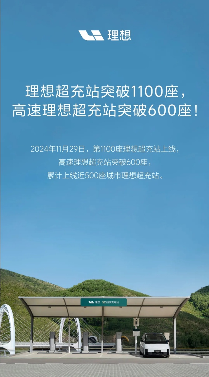 智通财经APP获悉,理想汽车-W(02015)今日宣布,11月29日,第1100座理想超充站上线,高速理想超充站突破600座,累计上线近500座城市理想超充站。据官方披露,高速理想超充站622座,高速理想充电桩2778根,覆盖高速服务区562个,覆盖高速公路出入口60个,已贯通国家级高速9条。年底累计将有700座高速理想超充站投入使用。