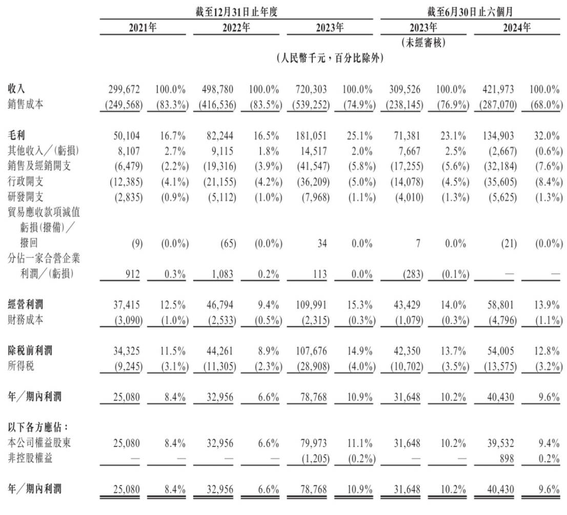财务方面,2021年、2022年、2023年、2024年截至6月30日止六个月,新吉奥收入分别约为3.00亿元、4.99亿元、7.20亿元、4.22亿元人民币。同期,该公司销售成本分别约为2.50亿元、4.17亿元、5.39亿元、2.87亿元人民币。