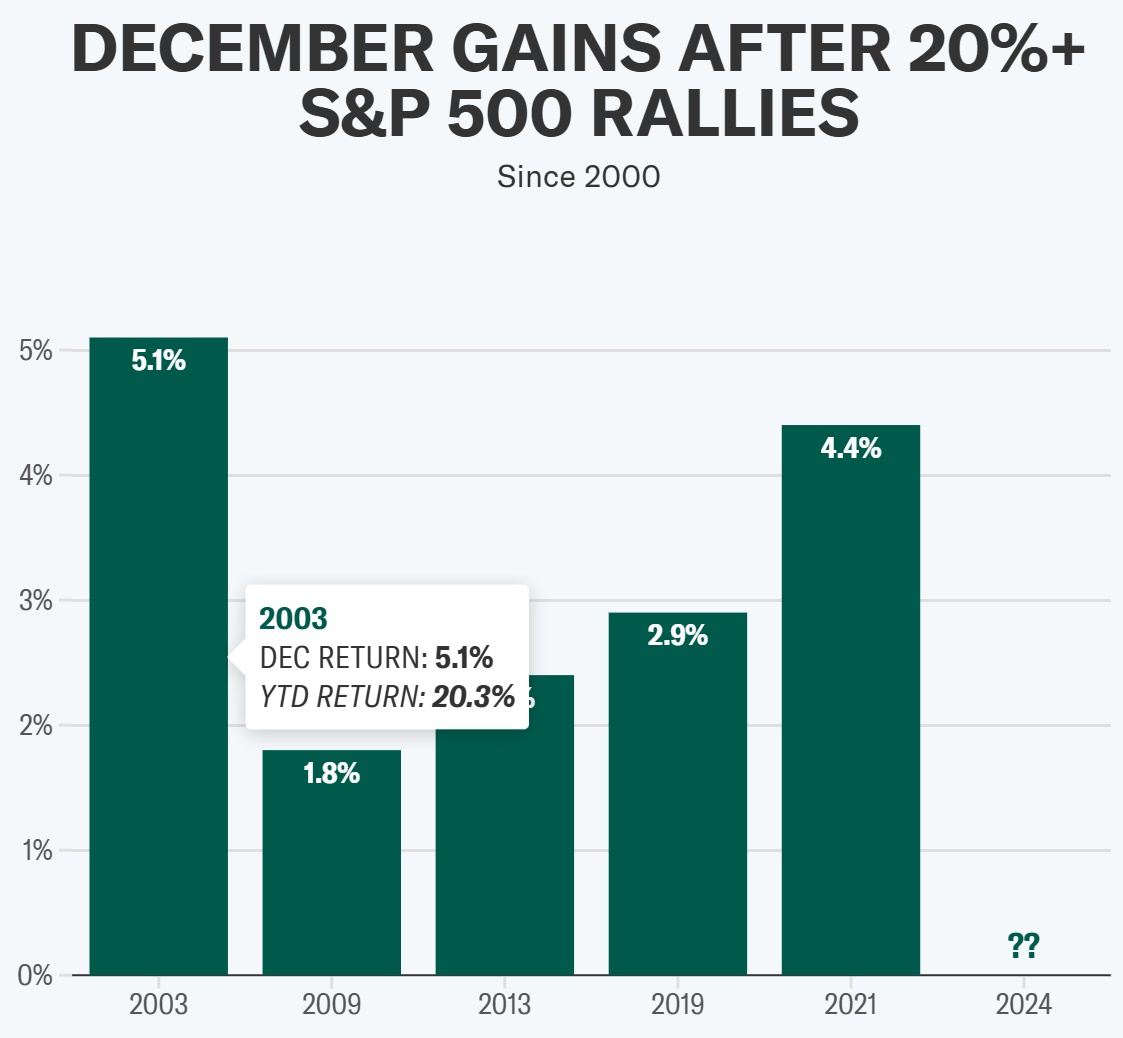 他的分析还发现,年初至今的强劲表现往往会增加投资者追逐市场至年底的可能性。在过去10次中,标准普尔指数进入12月份时涨幅超过20%,其中12月份的平均涨幅为2.4%。