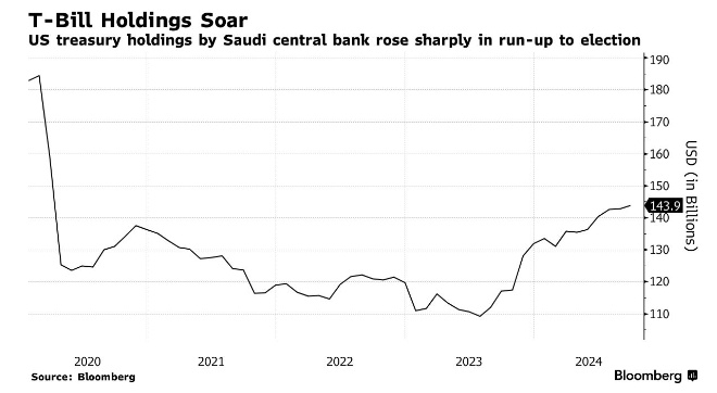 今年,沙特对美国国债的投资一直在增加,沙特央行目前持有1440亿美元的美国国债,尽管其外国资产总额已降至2月以来的最低水平。