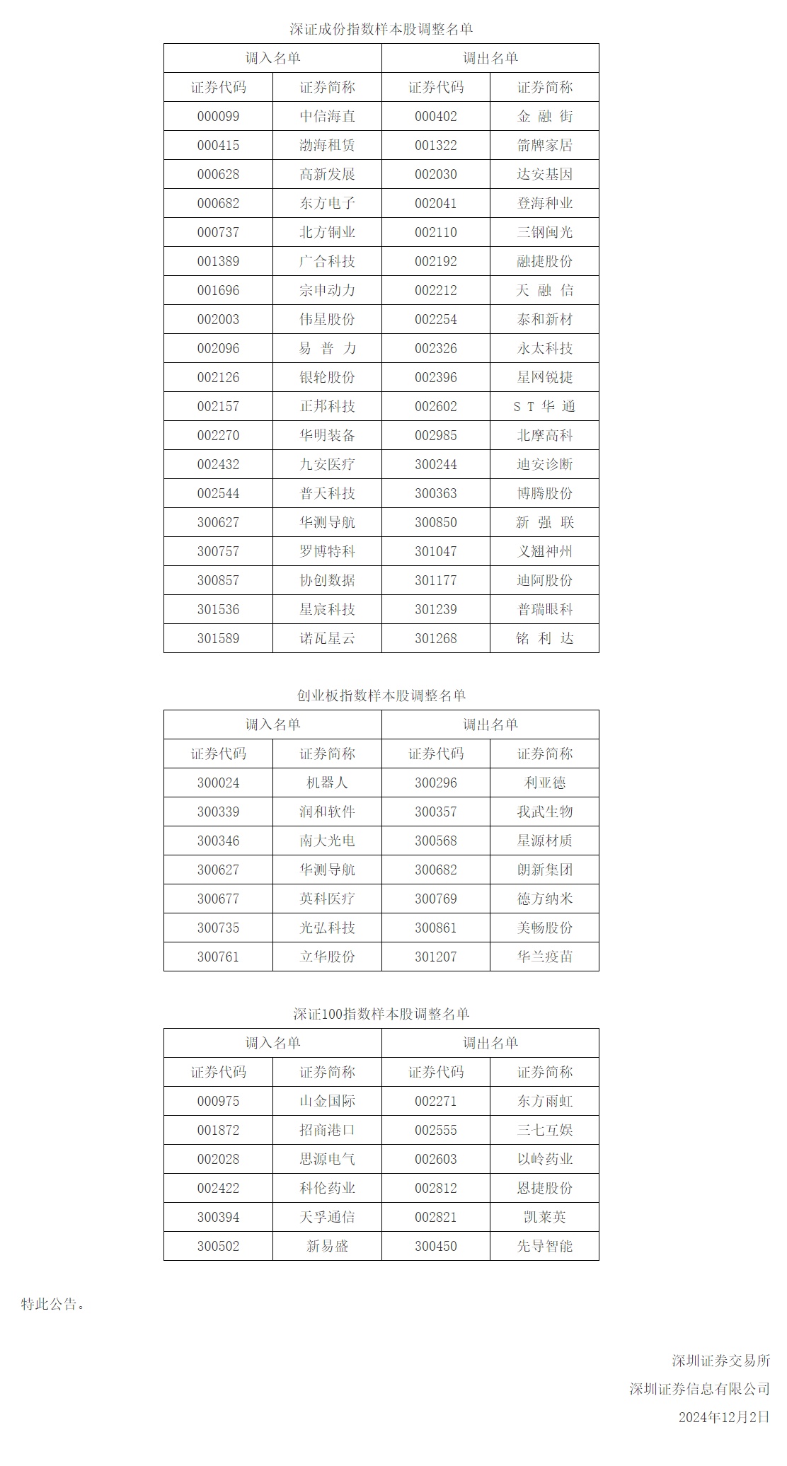 智通财经APP获悉,12月2日,深交所发布公告,根据指数编制规则,深圳证券交易所和深圳证券信息有限公司决定于2024年12月16日对深证成指、创业板指、深证100等指数实施样本股定期调整。其中,深证成分指数更换19只样本,创业板指数更换7只样本,深证100指数更换6只样本。