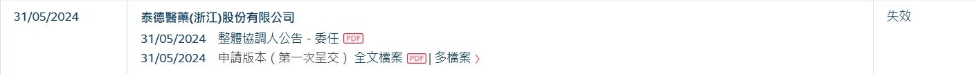 智通财经APP获悉,泰德医药(浙江)股份有限公司(以下简称:泰德医药)于2024年5月31日所递交的港股招股书满6个月,于12月1日失效,递表时摩根士丹利、中信证券为其联席保荐人。