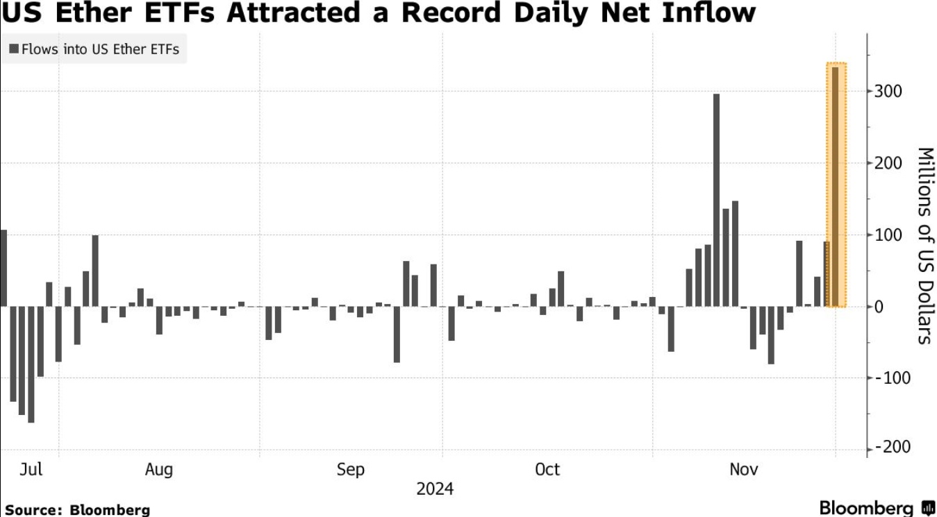 以太坊是市值规模仅次于比特币的全球最大规模加密货币,全球资金对以太坊的浓厚投资兴趣表明,在特朗普于11月5日赢得美国大选后,对加密货币的投机获利兴趣正在不断扩大。