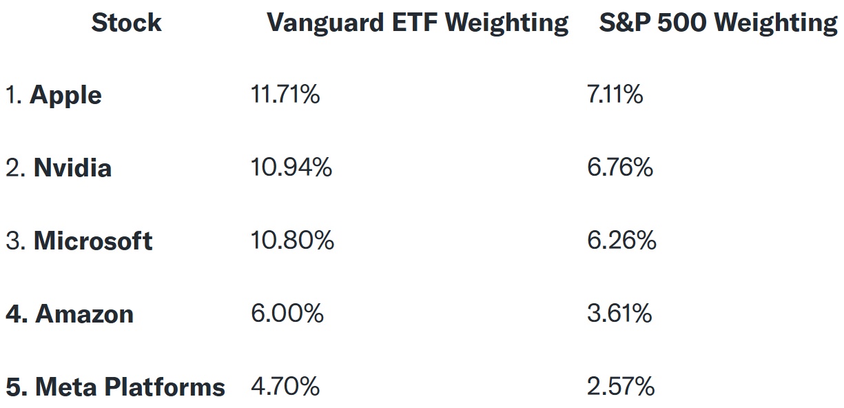 由于先锋成长ETF对这五只股票的权重高于标准普尔 500 指数,因此它在 2024 年实现更好的回报也就不足为奇了。