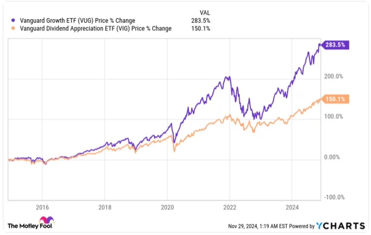 过去 10 年,先锋成长ETF的优异表现进一步加速,其年复合回报率为 15.2%,而标准普尔指数的年平均回报率为 13.2%。