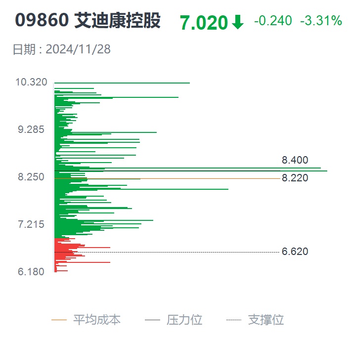 从该股的筹码分布来看,近2个月以来,9港元以上为筹码密集峰,密集峰筹码阻挡股价继续上行。直至11月26盘中一番大涨之后,艾迪康密集的高位上峰才出现一定松动,但目前来看,在8.22港元的成本均线附近,仍有较为集中的套牢筹码。因此,尽管陆续有获利筹码聚集,但高位筹码并没有被完全消化掉,大量筹码徘徊在成本均线上方,对公司股价上涨形成较强压力。