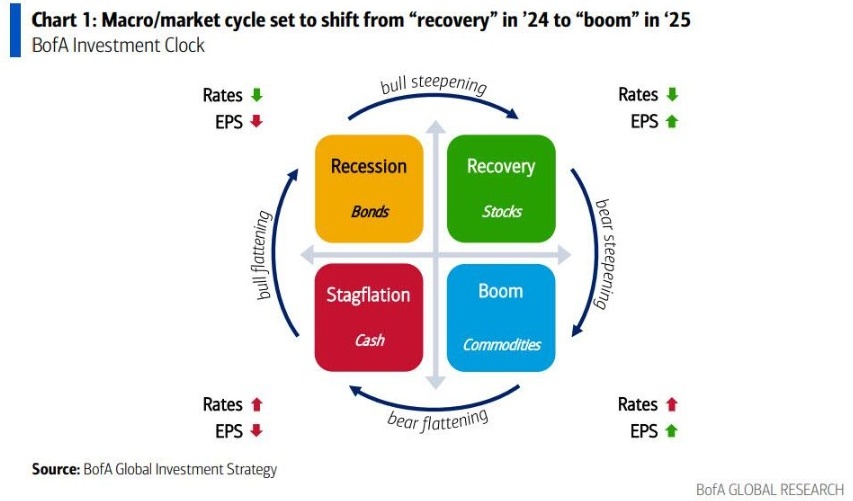 美银投资时钟模型显示,2024年股市的“复苏”阶段(特征为利率下降和每股收益上升)有望在2025年被商品的“繁荣”阶段(表现为每股收益上升和利率上升)所取代。这一转变的预兆将是第一季度收益率曲线的“熊市陡峭化”,届时债券将开始反映“通胀繁荣”而非“利率下调”的预期。