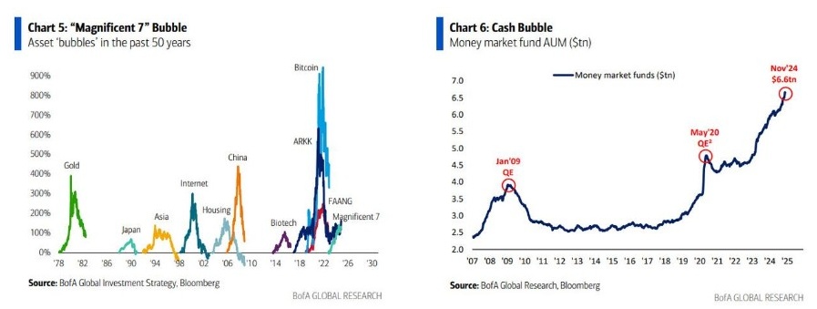 美银特别指出,AI/七巨头泡沫是当前最为显著的“尾部风险”,原因在于众多投资者预计,高达7万亿美元规模的货币市场基金最终将涌入美国股市(若第一季度更为紧缩的金融条件未能遏制投资者的投机热情,市场或将重现1999年的狂热景象)。在七大科技巨头泡沫中,美银认为,做多加密货币和具有低估值及科技属性的中国股票是应对这一风险的明智之选。